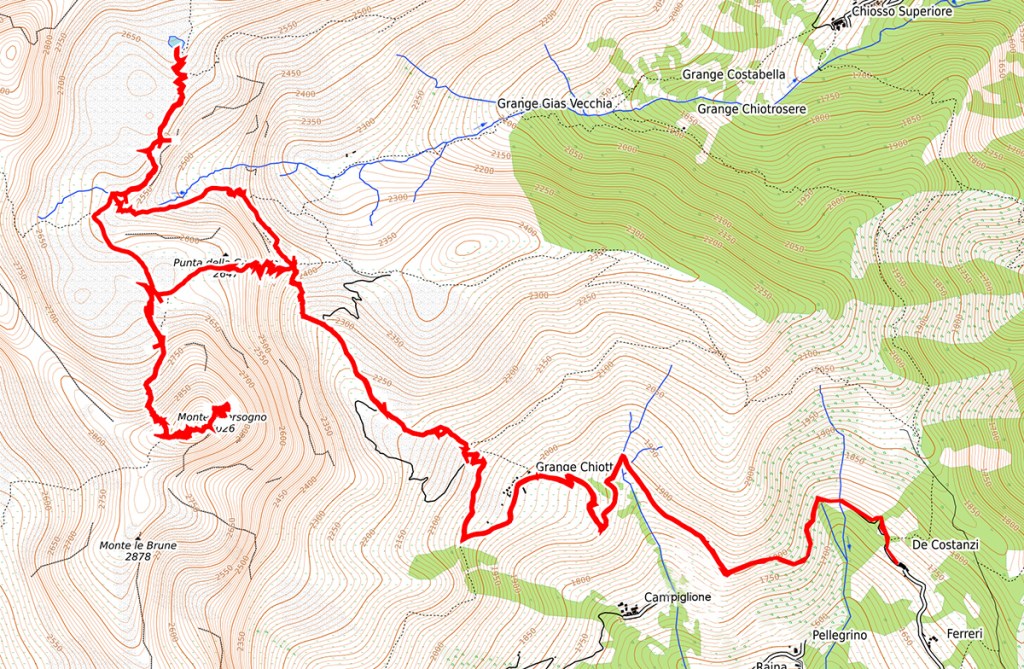 Dalla borgata De Costanzi (1714m) si prosegue verso il Vallone di Rio Crosia fino ad arrivare alle grange Chiotti (2002m).