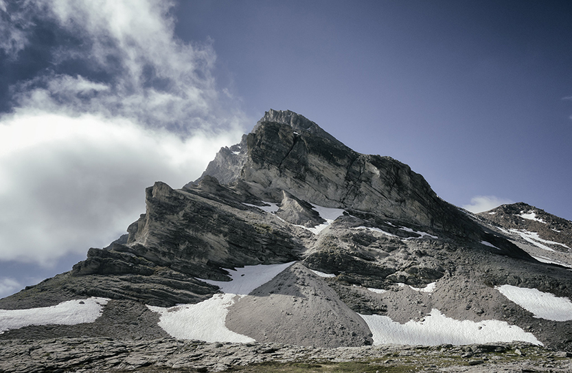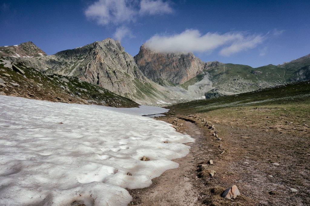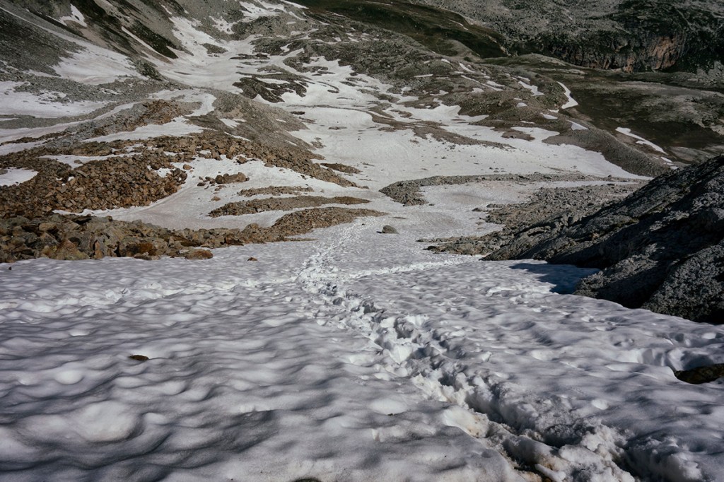 Sul pianoro il sentiero continua verso ponente, supera un modesto arco morenico poi, svoltando verso sud, taglia la china di detriti biancastri alla base nordoccidentale della cima, ancora ricoperti di neve.