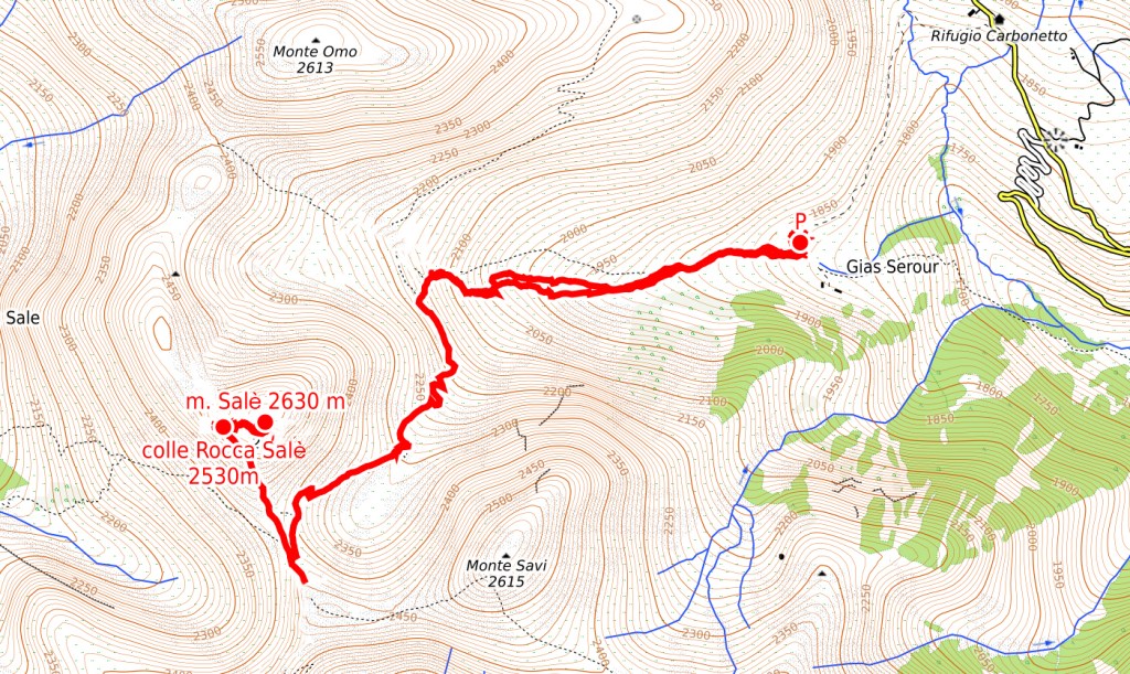 Circa 100m prima della costruzione, si svolta a destra e si procede su un sentierino che inizialmente sale verso ponente per sbucare nell’esteso avvallamento pascolivo tra il monte Savi e il monte Salè.