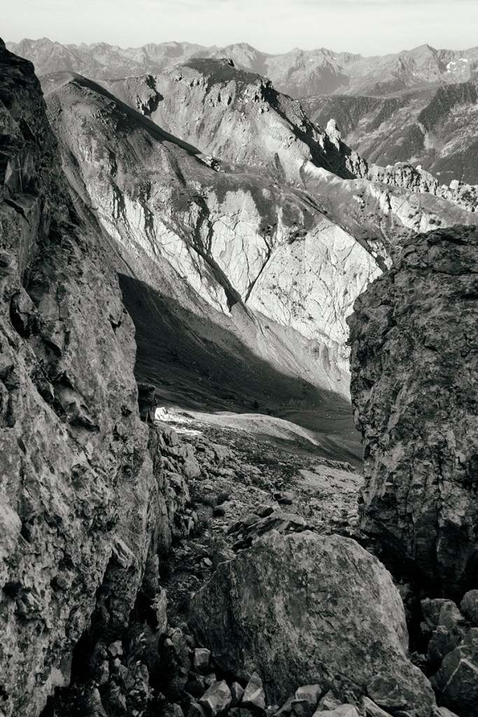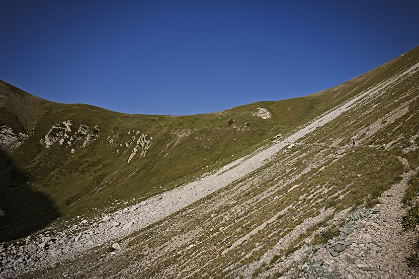 Da questo punto si segue il tronco superiore che taglia diagonalmente la ripida china di detriti fino ad un ampio canale sotto la cima.