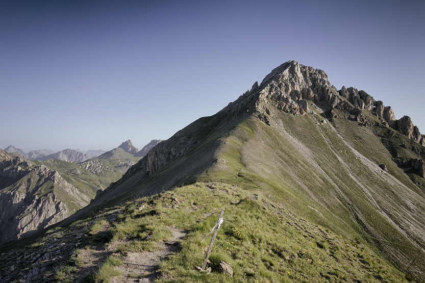 Arrivati al Colle Serour (2432m), molto panoramico, si procede verso destra lungo una traccia erbosa fino dove questa si biforca.
