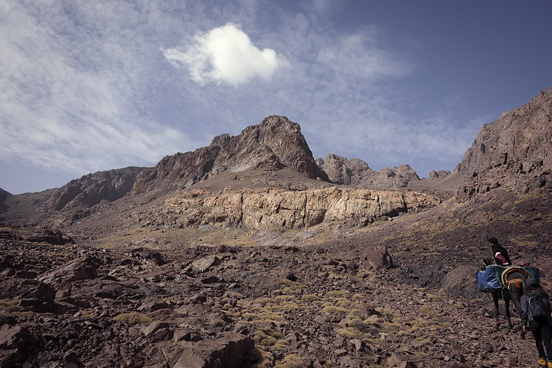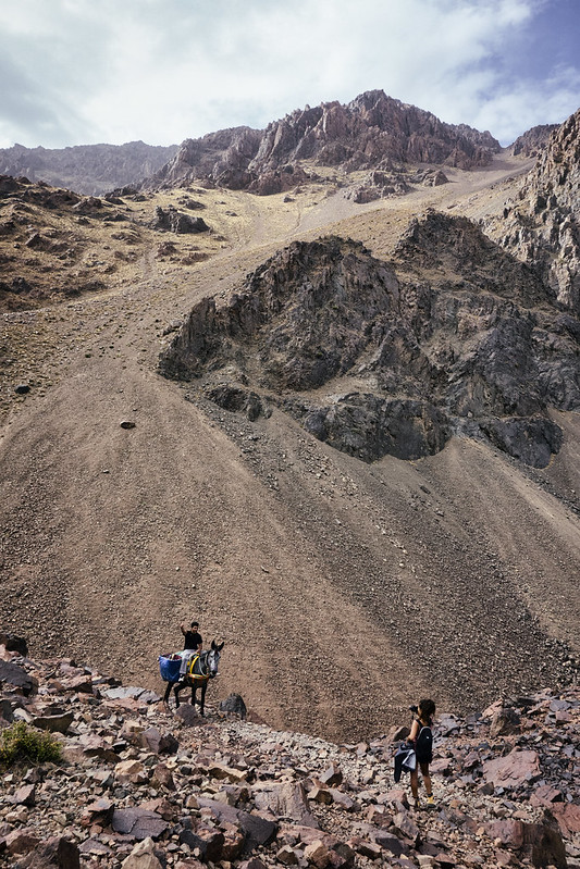 Decidiamo di proseguire con una guida “improvvisata”(non era una guida ufficiale, non abbiamo avuto modo di contattarla e dal rifugio hanno chiamato questo ragazzo, molto probabilmente uno del posto) che, oltre a indicarci il percorso, grazie alla sua cavalla Loubna, ci permetterà di liberarci del terribile peso dei nostri zaini. (negli anni ho migliorato lungamente questo aspetto acquistando zaini più confortevoli)