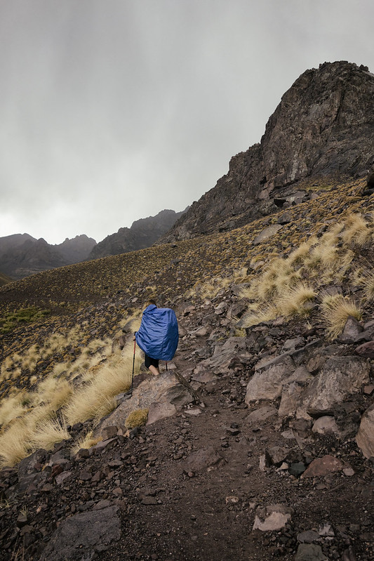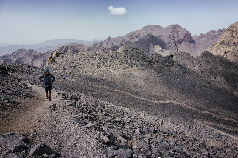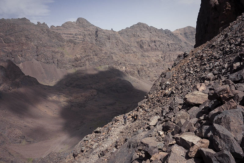 Poi si prosegue verso destra, una ripida salita di pietrame e sfasciumi, che ci conduce verso Tizi n’Toubkal (3950m).