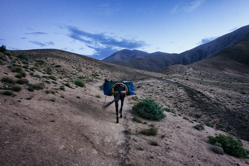 Volendo si può chiedere a un berbero della zona di trasportare i bagagli più pesanti sul dorso del suo mulo, cosa che noi abbiamo fatto. Gli aspetti positivi sono che lui conosce la strada e può viaggiare anche la mattina presto al buio. (Da notare che non ci sono pannelli con indicazioni per i vari sentieri ma soltanto qualche labile traccia bianca.) Gli aspetti negativi, sono la difficile comunicazione con lui, nonostante la mia amica fosse berbera e la presenza di una persona in più, che comunque condiziona l’escursione.