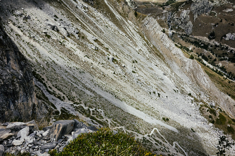 Dal rifugio Stroppia si scende con stretti tornanti scavati nella roccia fino ad arrivare a un pendio ghiaioso e si svolta a destra per poi proseguire in direzione Chiappera.