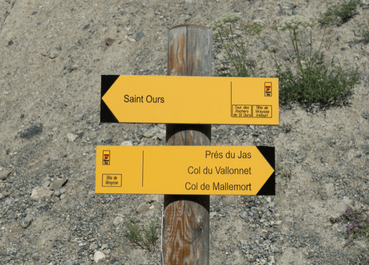 Raggiungiamo il paesino di Saint-Ours dal colle della Maddalena, svoltando a destra da Meyronnes. Entrando nel borgo, svoltiamo a destra fino ad arrivare ad una fontana, dove lasciamo l’auto. Proseguiamo la sterrata in direzione est.