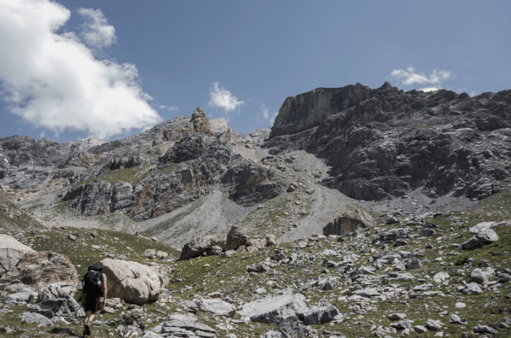 A quota 2350 circa si prosegue in “traverso” su un pendio erboso e si raggiunge una conca ingombra di grandi massi, ai piedi del detritico canale, dove comincia la vera e propria salita.