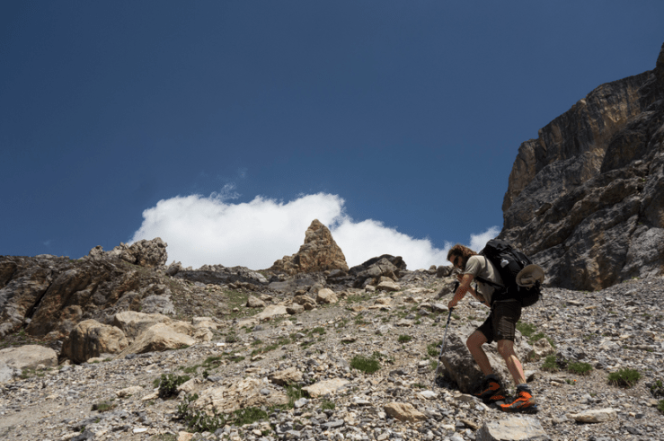 In alto a sinistra, spicca una guglia giallo-rossastra che ci darà la direzione. La salita si impenna ma il panorama è superbo. Raggiunta la sommità della guglia, si attraversano delle rocce e dei massi.