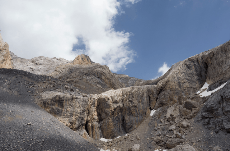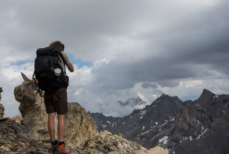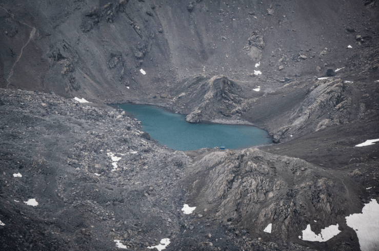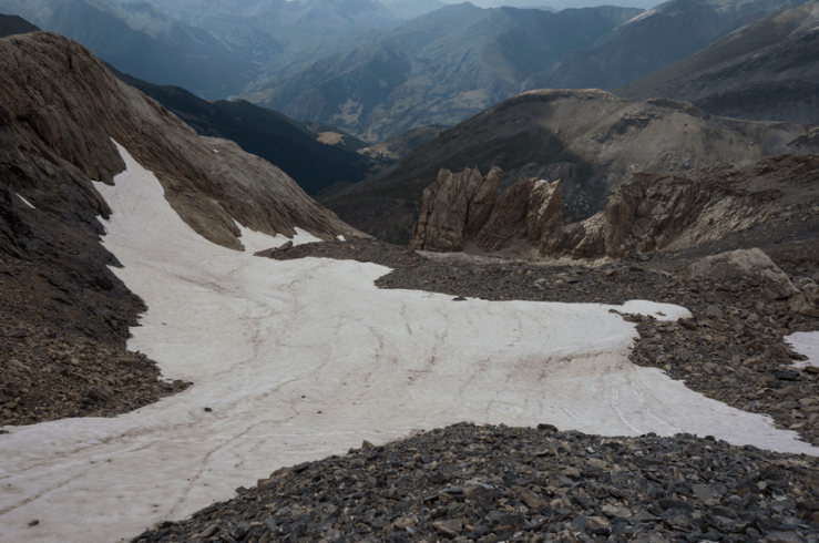 All’altezza di un grande “ometto”che lasciamo alla nostra destra (da lì arriva la via alpinistica italiana), seguiamo la traccia che rimonta a zig-zag una ripida balza rocciosa fino al bivacco Montaldo (3205 m.) e, alle sue spalle, la cima del Buc de Nubiera 3215 m.
