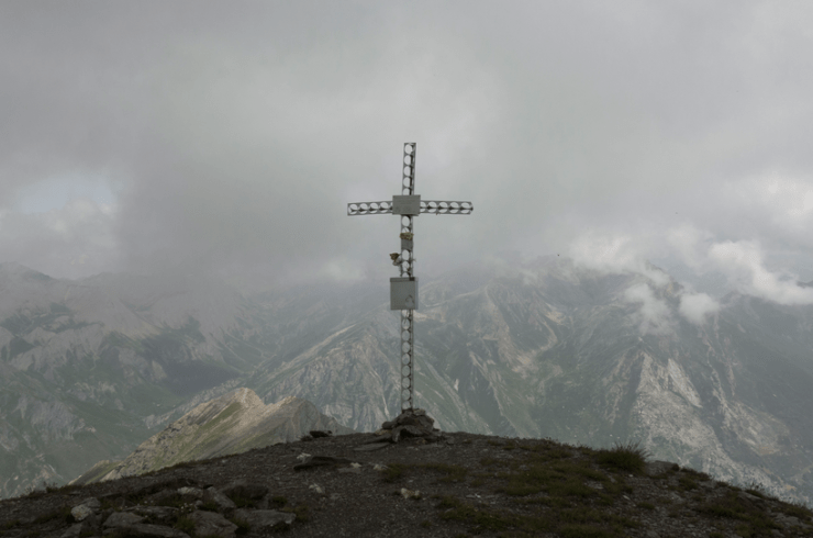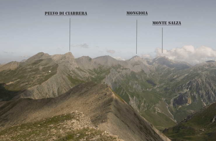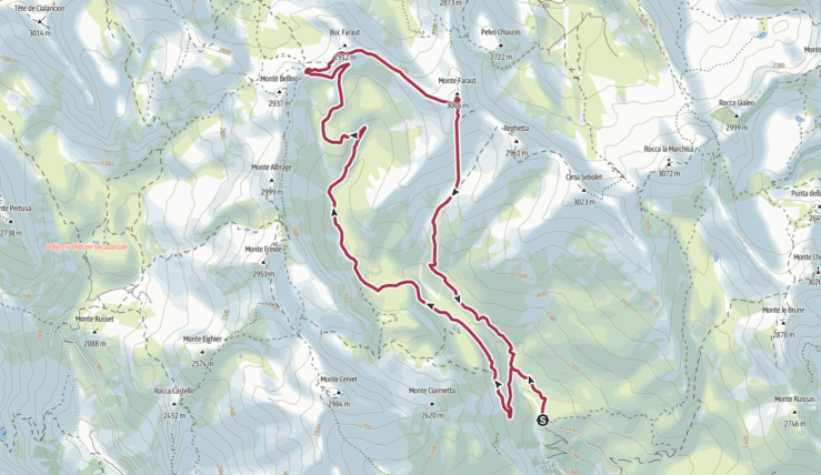 All’altezza dell’ultimo tornante si segue a destra una labile traccia fra i detriti che, con comoda salita diagonale, raggiunge l’ampia insellatura compresa fra il detritico Buc Faraut e la lunga dorsale che culmina con l’arrotondato Monte Faraut. Sul versante opposto appare la Valle Varàita di Bellino, con il monte Mongiòia (3340 m) e il Monte Salza (3326 m).