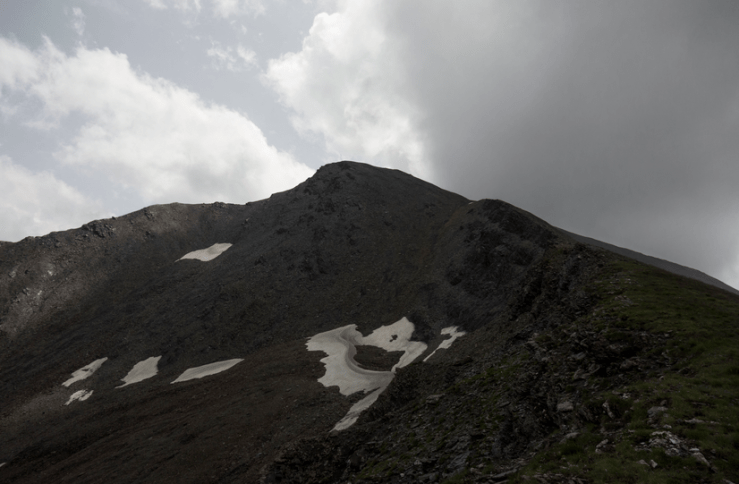 Con un tratto di ripida e faticosa salita per detriti nerastri si scavalca un dosso di sfasciumi, quindi si guadagna una spalla, ormai ai piedi del cupolone sommitale.