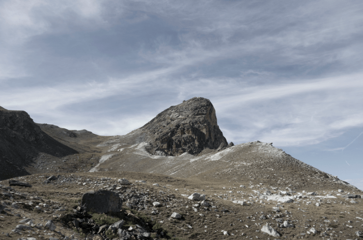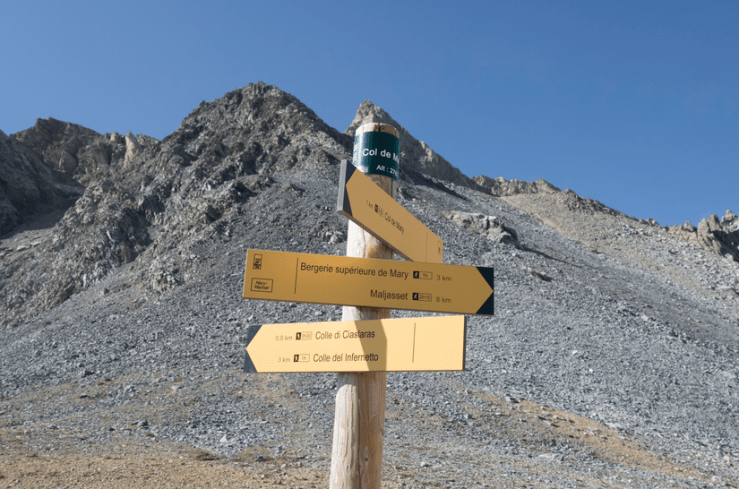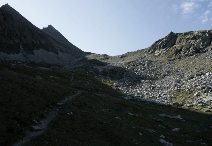Il percorso è piacevole, si percorre una bella mulattiera a zig zag che ci mostra un altro interessante panorama sulle cime circostanti. Ma sopratutto ci fa ancora ammirare la bella Aiguille Large.