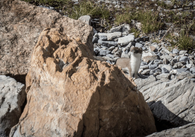 Seduti in contemplazione veniamo piacevolmente disturbati da due esserini che ci girano attorno: subito non li riconosciamo, poi guardandoli bene scopriamo che sono ermellini. Che gioia! E’ il mio primo incontro con loro!