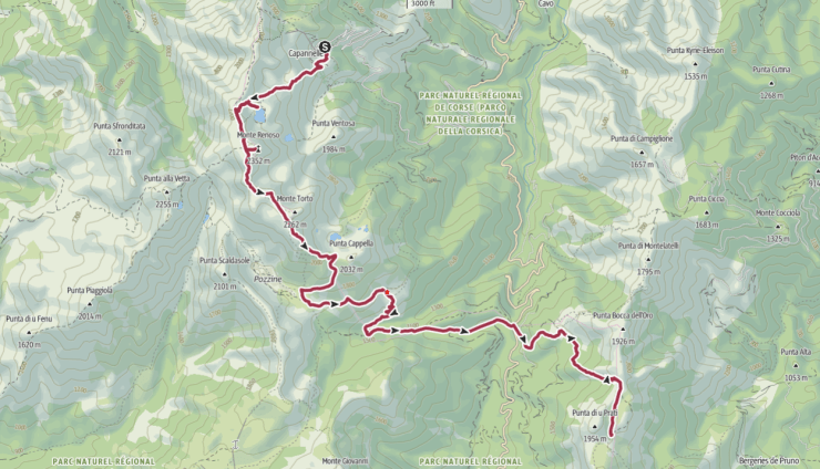 Continuo il mio cammino sulla cresta Pietraghjone per raggiungere Bocca di u Prunu (1972 m). Da Bocca di u Prunu scendo verso le fattorie dei Pozzi. Seguo un sentiero sulla sinistra verso l’altopiano di Ghjalgone.