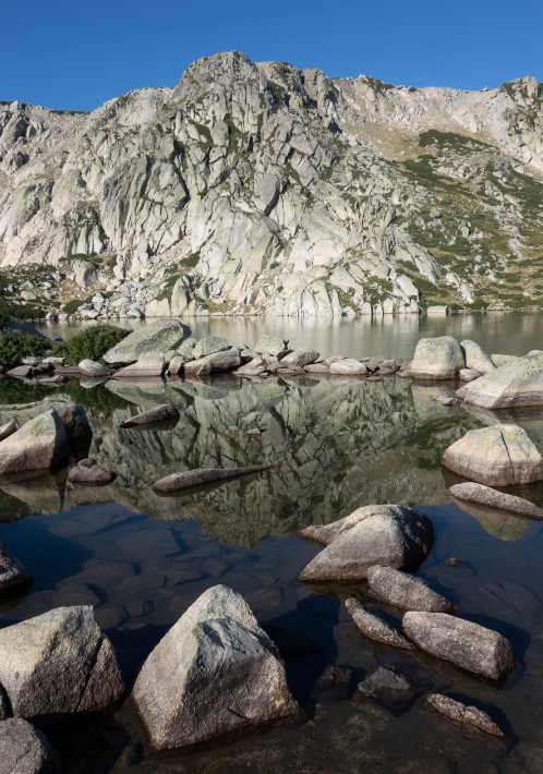 Il lago di Bastani (2092 m) è davvero una meraviglia! Mi accolgono grandi massi granitici che ricoprono le sue sponde e nelle acque azzurre si specchia il monte Rinosu.