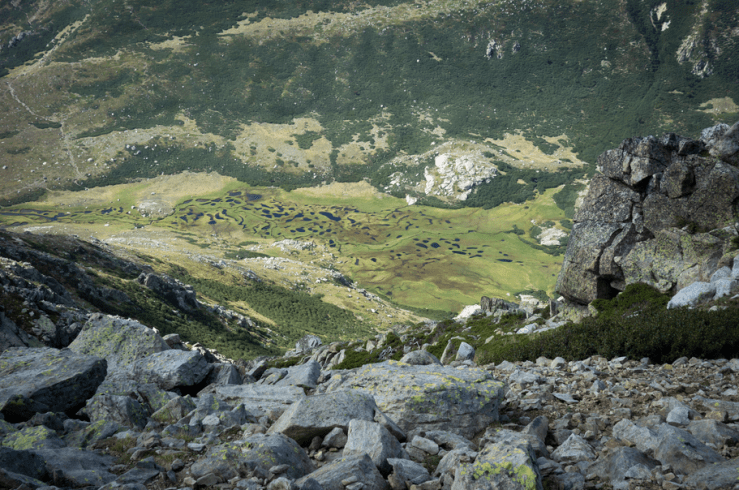 Dal monte Rinosu, continuo verso sud. Il sentiero passa sopra la Punta di Valle Longa (2281 m), bellissimo panorama sui laghi di Vitalacca e di Bracca.