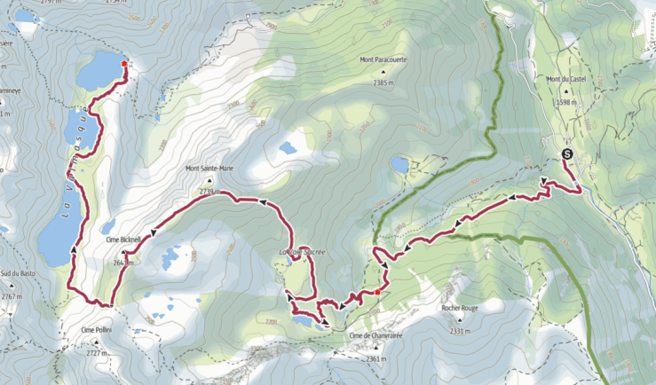 Proseguiamo verso una costruzione in pietra e ci avviamo verso destra costeggiando i due piccoli laghetti seguendo il sentiero in discesa che subito dopo passa accanto ad una torbiera; al successivo bivio si prende a destra giungendo poco dopo al Lac Vert de Fontanalbe (lago Verde di Fontanalba), lo si costeggia sulla sinistra e subito dopo ci si ricongiunge al percorso di salita in corrispondenza del ponte in pietra.