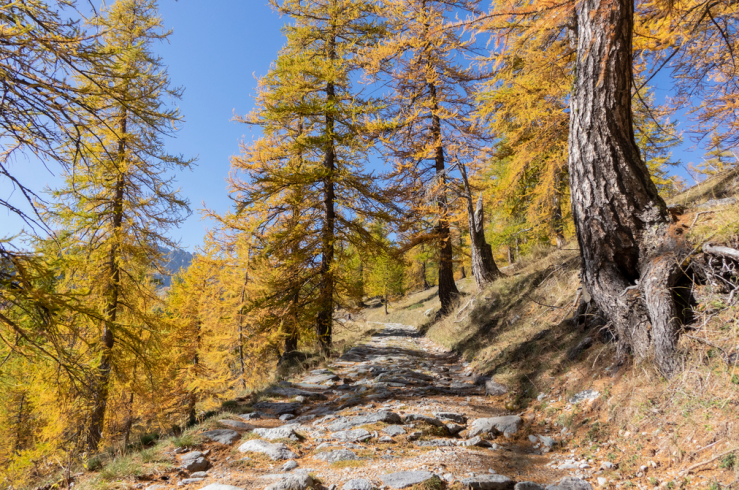 Seguiamo le indicazioni per il Rifugio di Fontanalba, e percorriamo una bella strada lastricata con un percorso tra i larici in tutta la sua bellezza autunnale.