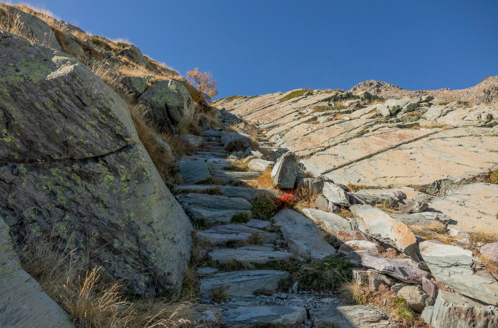 Dal Rifugio Valmasque ci inerpichiamo sulla mulattiera verso il lac Noir. Poco prima dello sbarramento la abbandoniamo per seguire un sentiero sulla destra per poi proseguire innalzandosi sulle ripide pendici della sovrastante cime Chamineye (2921 m).