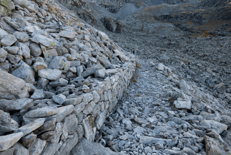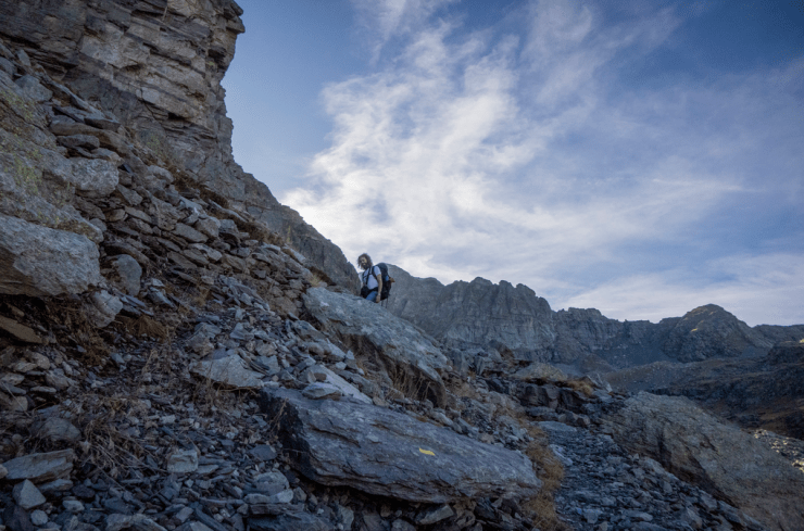 Per la salita al pas de la Fous seguiamo sulla sinistra le tacche rosse e ometti, risalendo una ripida pietraia.