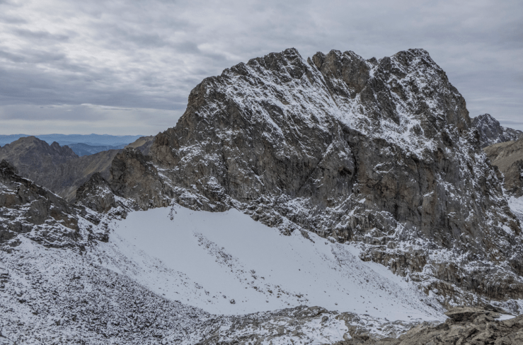 Vista bellissima sulla vicina parete est del Monte Clapier e sul sottostante, omonimo ghiacciaio. Il massiccio dell’Argentera spicca a nord-ovest