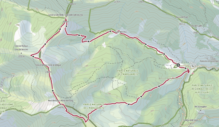 Questo vuole essere un anello che, partendo da Upega, raggiunge la Colla Rossa passando dal bosco delle navette. Poi si sale su Cima Bertrand e si prosegue in cresta fino al Colle delle Selle Vecchie. Dal valico si ritorna a Upega passando da case Nivorina.