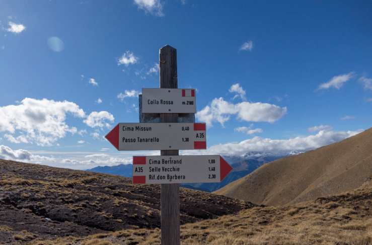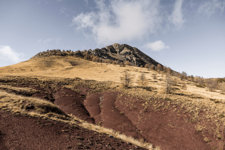 In breve giugno alla Colla Rossa (2175 m), il valico, il cui nome deriva dal terreno circostante costituito da roccette e scaglie rosse, si apre tra il Monte Bertrand (a destra) e la Cima Missun (a sinistra), tra la Val Tanaro e la Val Roja.