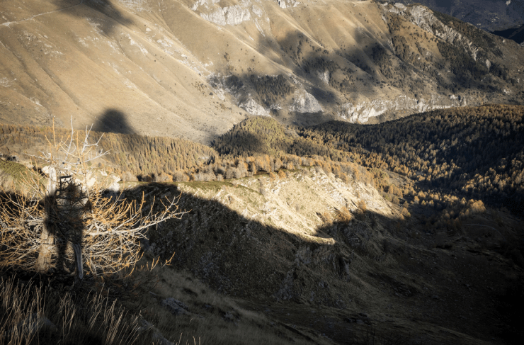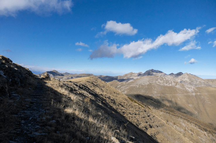 Continuo a percorrere la bellissima cresta in direzione Nord-Est lungo l’evidente sentiero di cresta che scende verso Cima di Velega (2385 m) e prosegue verso il Colle del Vescovo (2190 m) per raggiunge il colle delle Selle Vecchie (2099 m).