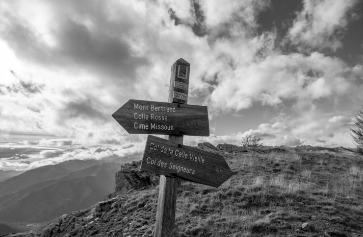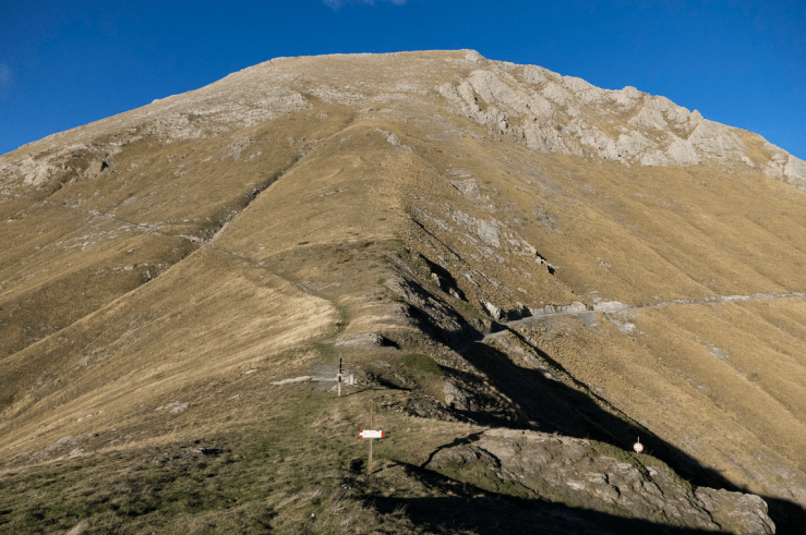 Si prosegue sempre sotto la cresta di confine con un lungo traverso in salita fino a che appare al di sopra la grossa croce del Monte Bertrand (2482 m).