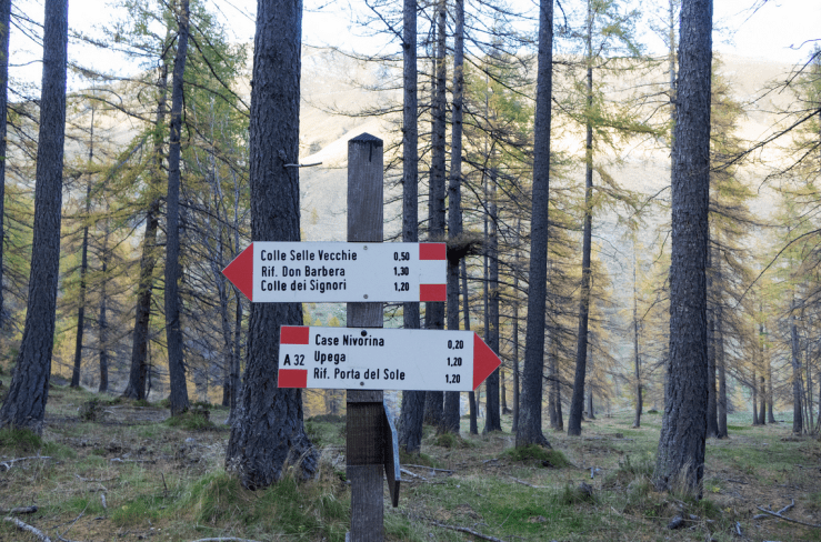 Qui si ritrova la strada sterrata per Monesi, la si percorre in discesa per circa 400 m sino a trovare sulla sinistra una palina che indica la via per Upega.
