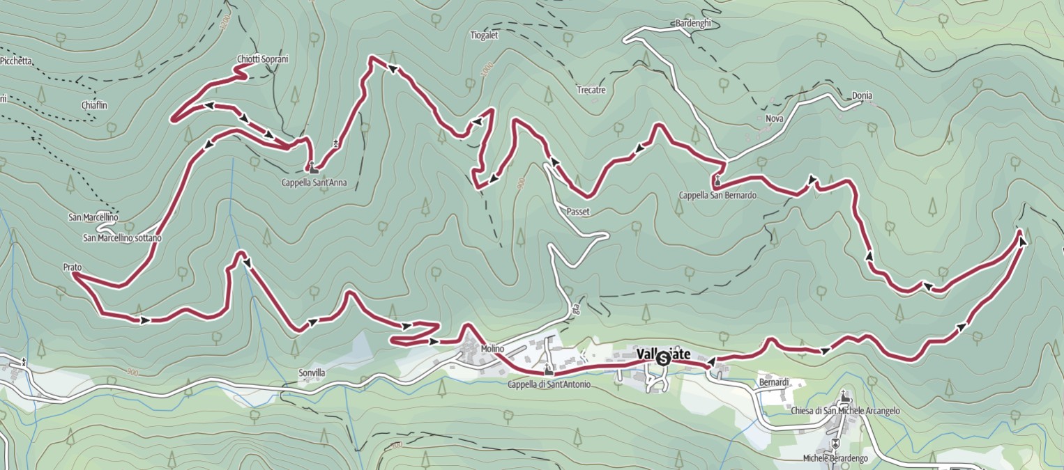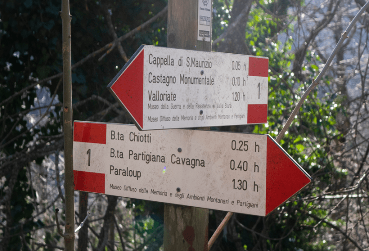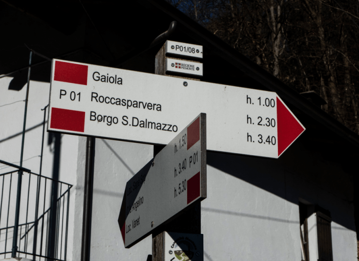 Si parte dalla piazza del Municipio di Valloriate (795m) e si percorre a ritroso la strada asfaltata fino ad un cartello che indica “Gaiola, Roccasparvera, Borgo S. Dalmazzo.”