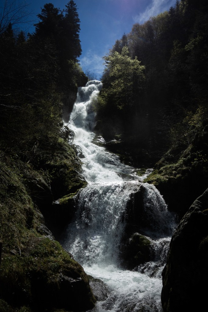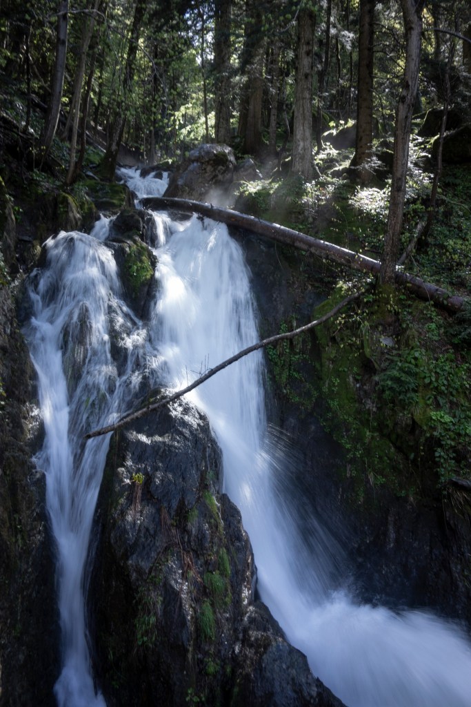 Attraversiamo questo primo torrente su un ponte in legno, portandoci alla seconda cascata delle due Cascate del Saut (1222 m circa, 0:35 – 0:40 ore da Pian delle Gorre), dove un comodo balcone in legno consente di godere al meglio lo spettacolo.