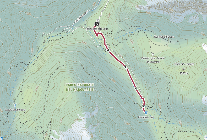 Non resta che attraversare il corso d’acqua grazie a grossi blocchi in pietra e rientrare lungo la strada sterrata a Pian delle Gorre (1032 m, 0:25 – 0:30 ore dalle Cascate del Saut). (attenzione a questo passaggio che rischia alle volte di essere scivoloso).