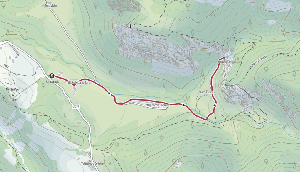 La mulattiera prosegue attraversando diverse abitazioni (fontana) e si immette su una strada sterrata a monte delle case . Si continua verso sinistra, con pendenze poco più accentuate. Si lascia a sinistra la piccola carrareccia che conduce ai Tetti Tancias, quindi si raggiunge il bivio, ancora a sinistra, per la Cascata di Tetti Tancias.
