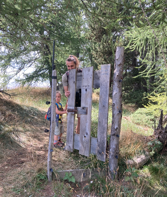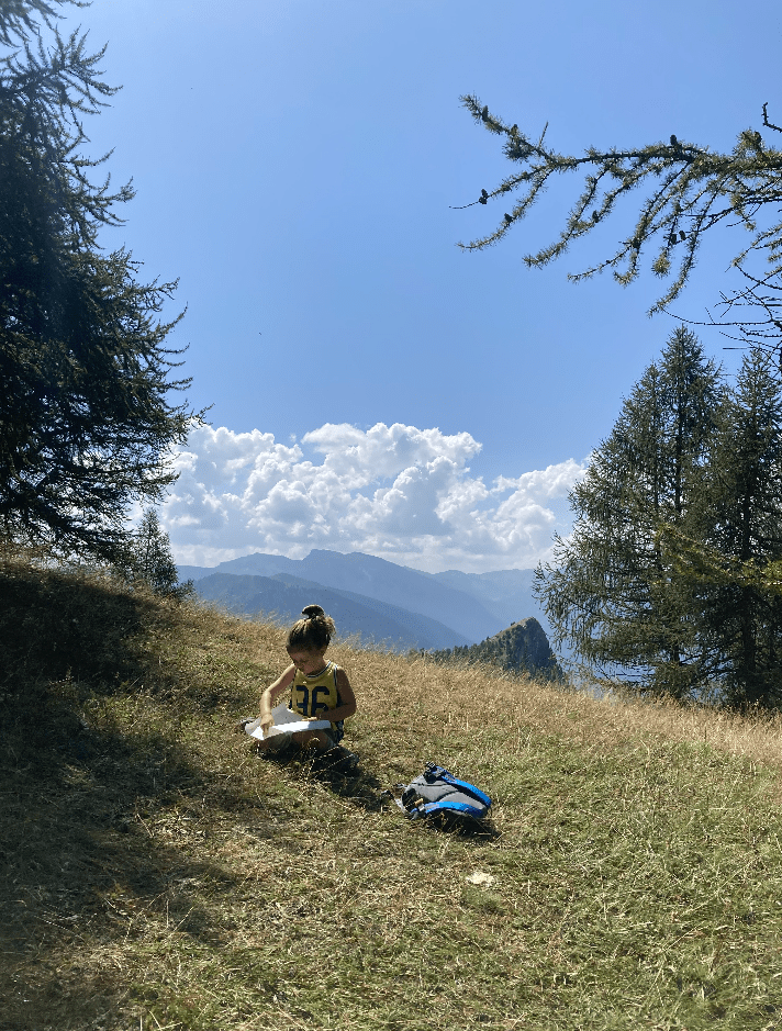 Qui, scendiamo in un piccolo bosco, e ci fermiamo a metà strada ad ammirare il monte Bettone controllando la nostra mappa fatta da Giacomino per raggiungere la vetta.